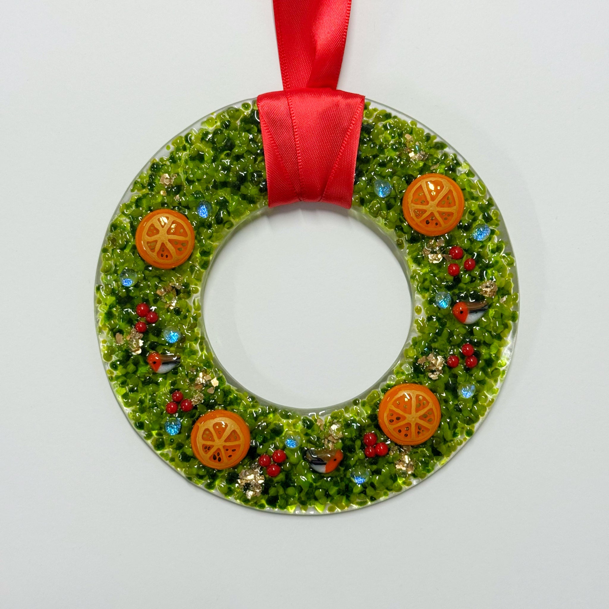 Celebrate the magic of the season with this handcrafted fused glass Christmas wreath. Each wreath is meticulously crafted with hand-cut, hand-painted glass elements, featuring vibrant orange slices, berries, sparkles and a few wee robins. These festive accents are further elevated with 22 karat gold highlights, adding a touch of elegance and warmth to your holiday decor.